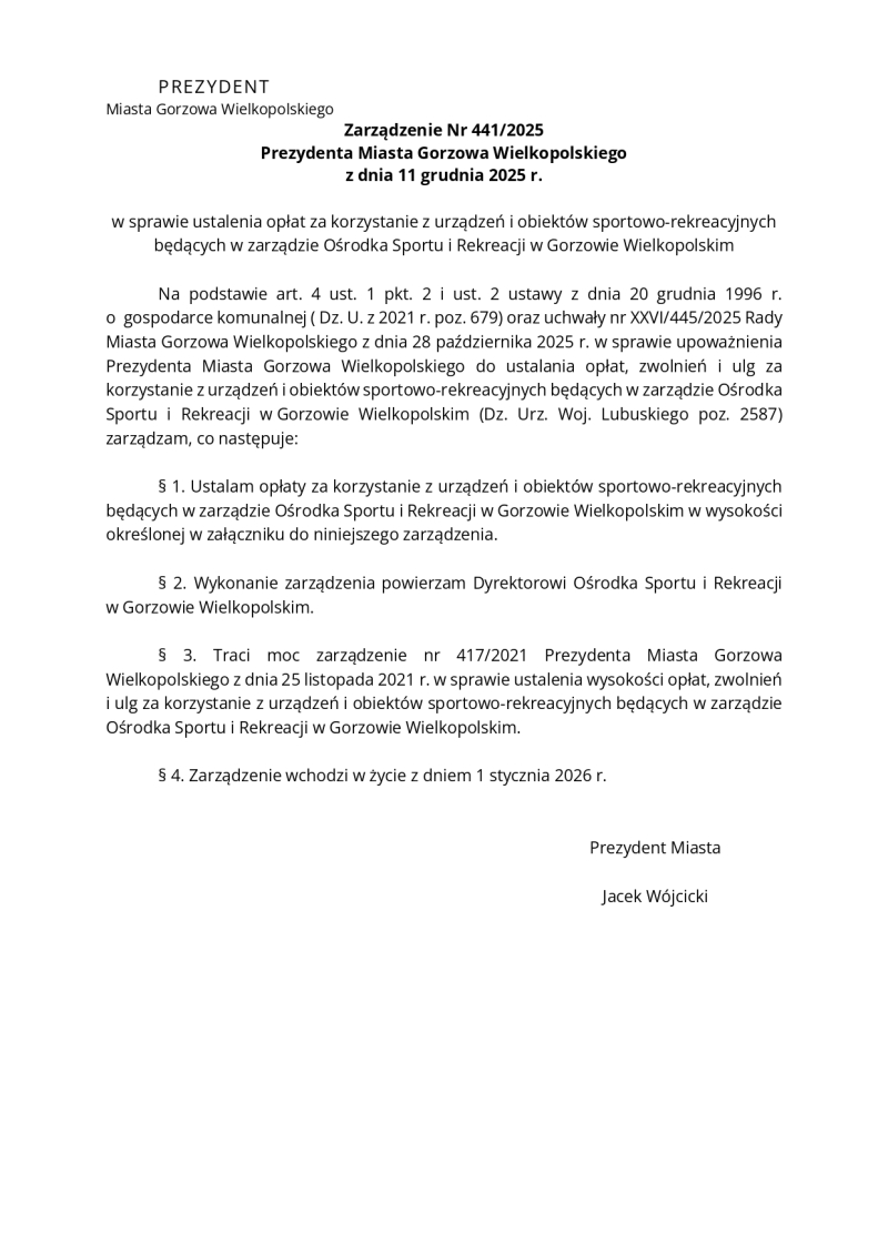 5/5 Zarządzenie prezydenta Gorzowa w sprawie likwidacji stawek 1 zł za obiekty sportowe