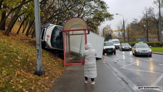 Przewrócony bus na Pomorskiej