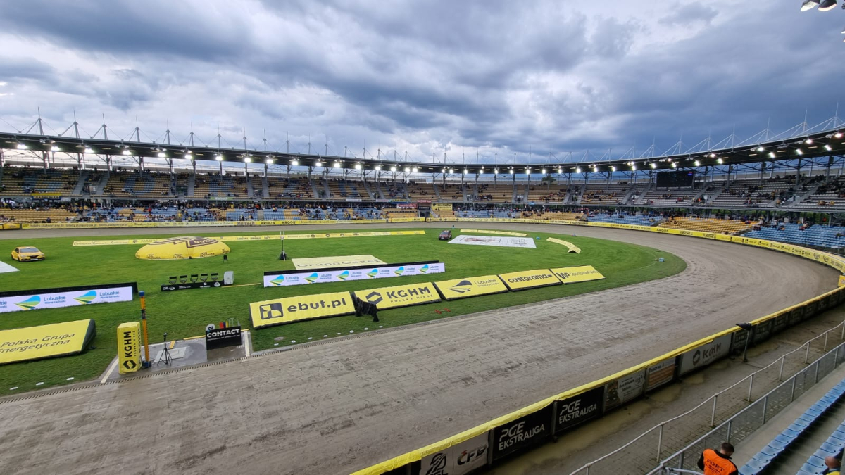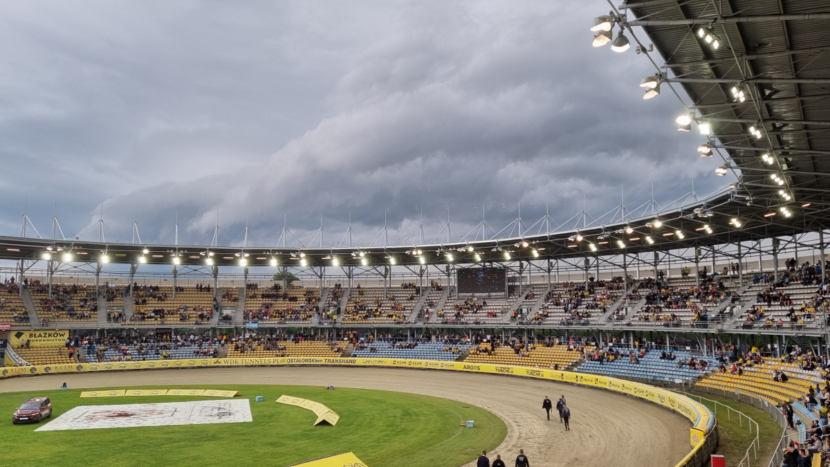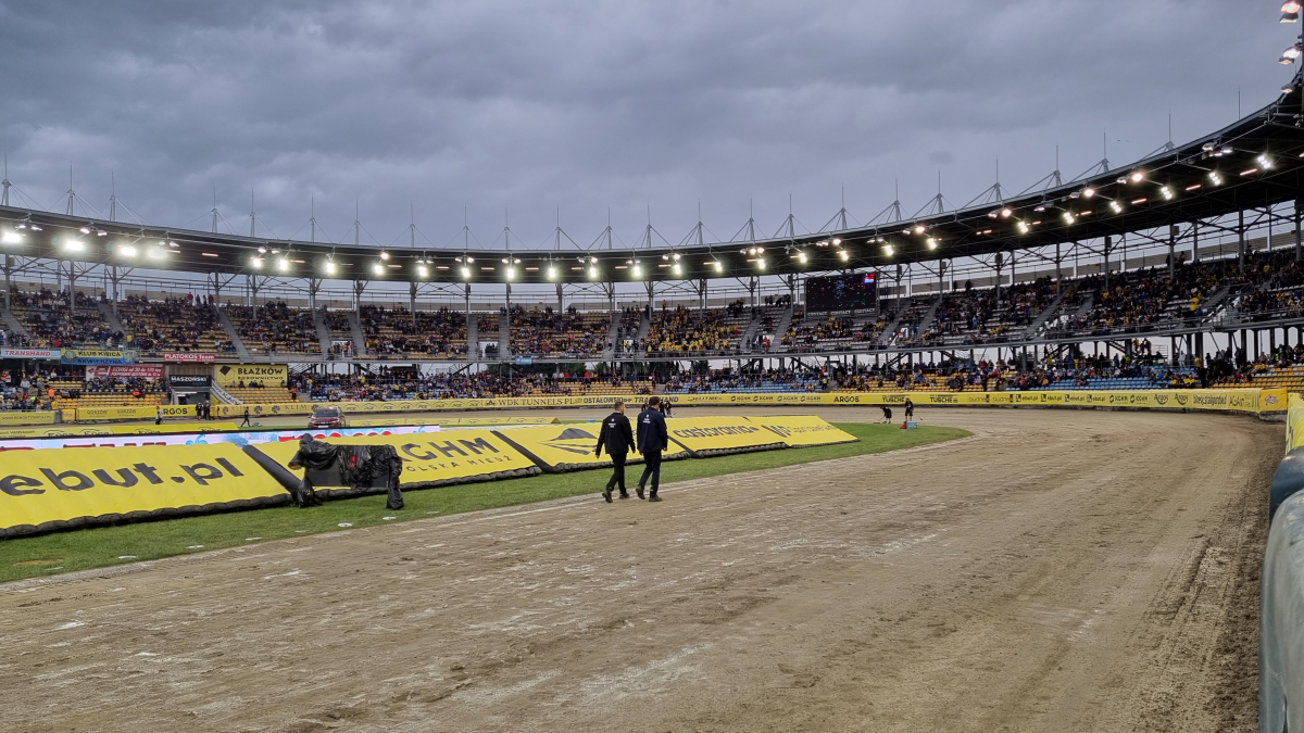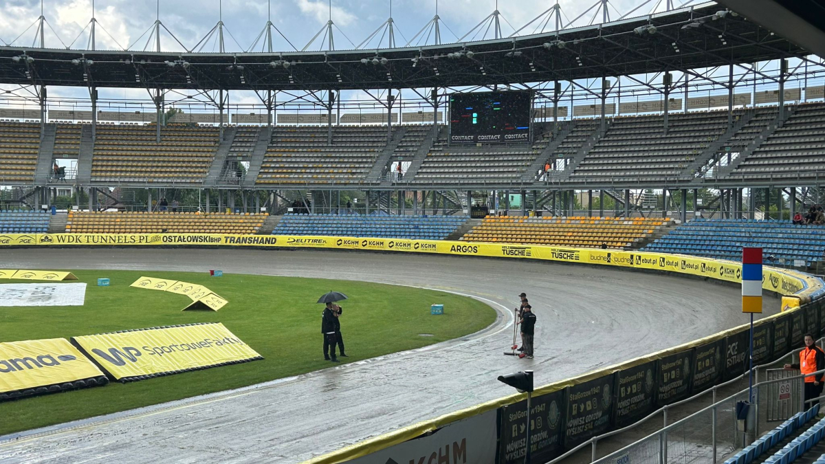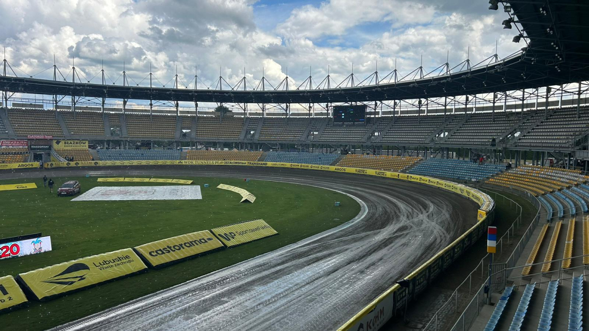 Nad stadionem ciężkie chmury, co jakiś czas pada deszcz. Tak wygląda obecnie tor na Jancarzu