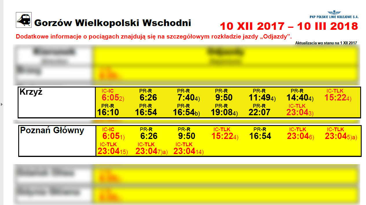 Jedynie trzy na 9 pociągów, które odjeżdżają w kierunku Krzyża i dalej Poznania wyjadą z Gorzowa mniej więcej w tym samym czasie. 6 par odjedzie wcześniej lub później. Zmiana nie dotyczy połączeń o 7:41 i 9:45 i 14:30. Tu są korekty kilkuminutowe. Pasażerowie jeżdżący do Poznania, muszą pamiętać, że ostatni pociąg REGIO w tym kierunku z Gorzowa odjedzie 22 minuty wcześniej. Do tej pory była to 17:15, teraz będzie 16:54. Zmianie tez ulega godzina odjazdu powrotnego pociągu do Gorzowa. Szynobus do naszego miasta zamiast o 19:52, odjedzie z Poznania już o 19:02.