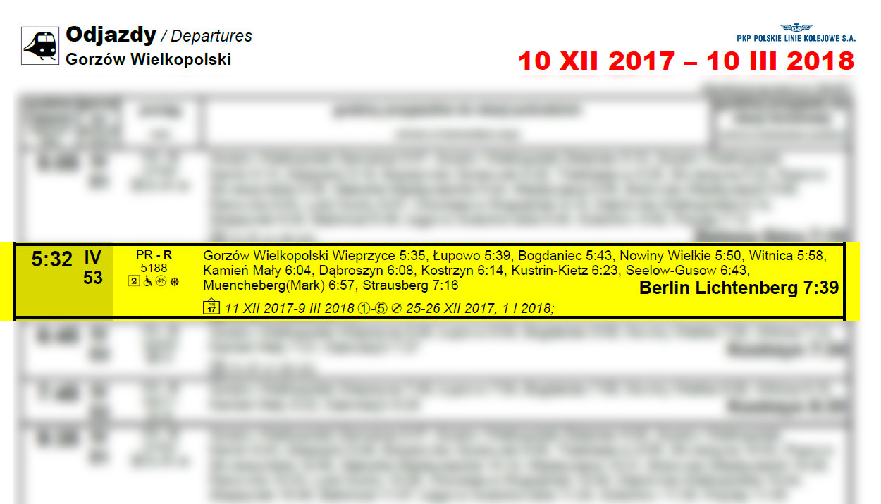 Ci, którzy wcześnie rano jeżdżą do Berlina, bardzo ucieszą się z późniejszej godziny odjazdu pociągu z Gorzowa. Niemiecki szynobus do stolicy Niemiec wyjedzie o 5:32, a na miejsce przyjedzie tylko minutę później niż dotychczas, czyli o 7:39. Poranna podróż do Berlina będzie więc o 37 minut krótsza.