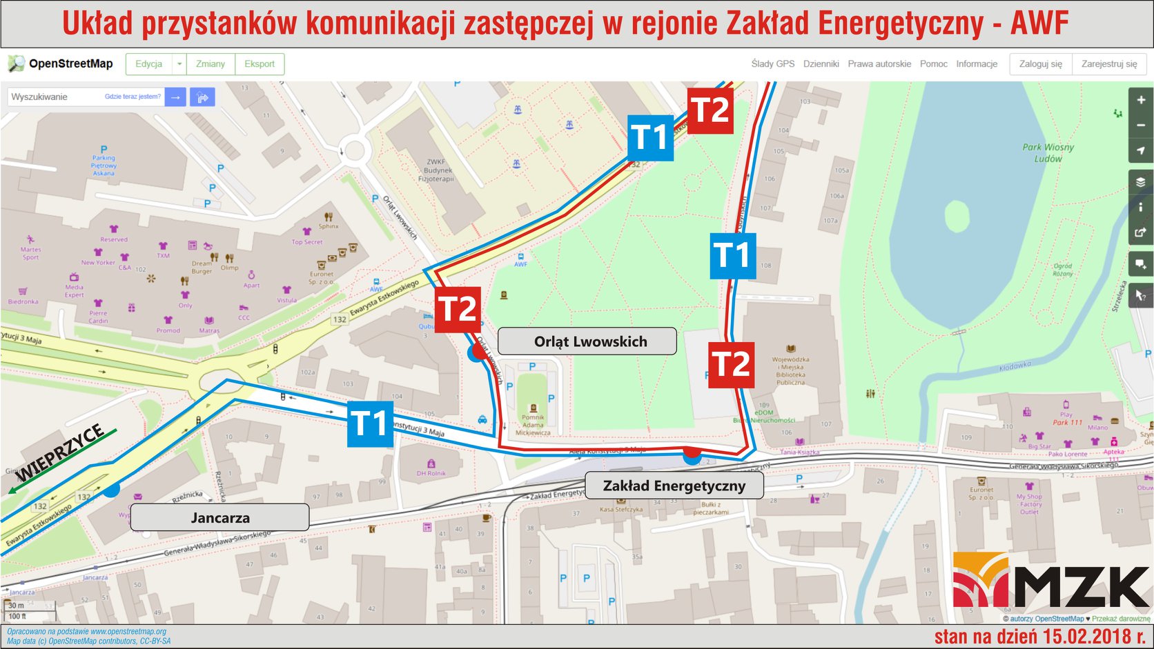 Zawieszone zostaną przystanki Arsenał w kierunku Piasków i 30 Stycznia w obu kierunkach, natomiast zostanie uruchomiony przystanek Puszkina (w okolicy I LO). Najdogodniejszym miejscem do przesiadki na i z obu linii zastępczych jest węzeł przystanków Zakład Energetyczny – Orląt Lwowskich.