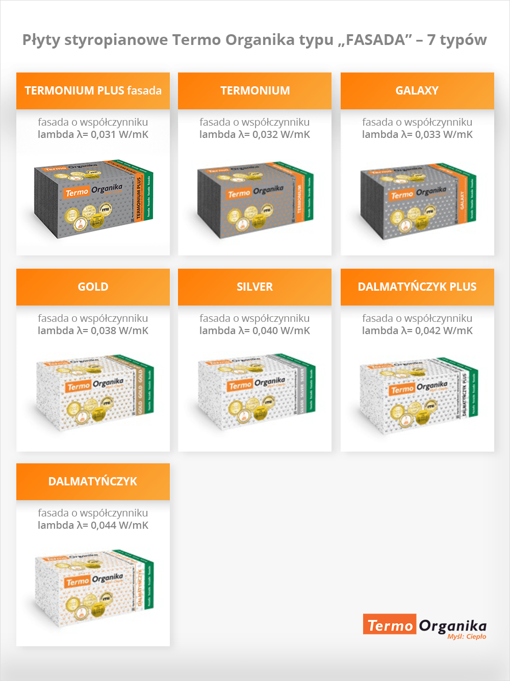 Podstawowym materiałem termoizolacyjnym, którym możemy ocieplić dom, jest styropian. Najważniejszym elementem składowym Kompletnego Systemu Ociepleń Termo Organika są płyty styropianowe typu „FASADA” dostępne aż w 7 odmianach różniących się właściwościami izolacyjnymi i parametrami mechanicznymi, co przedstawia grafika.