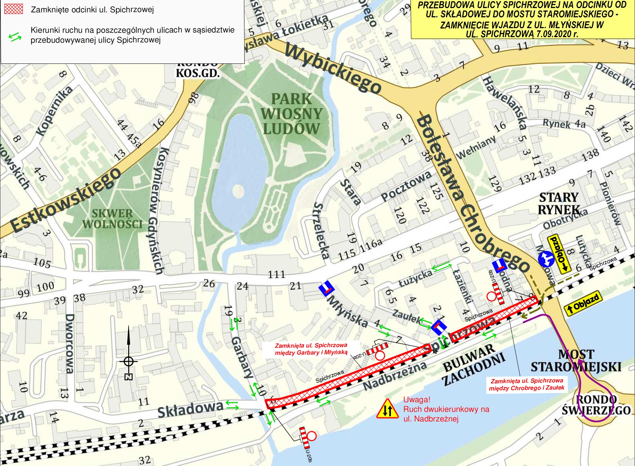 Firma Eurovia zapowiada, że w poniedziałek 7 września przystąpi do kolejnego etapu prac. Tym razem zostanie zamknięte skrzyżowanie ul. Spichrzowej i Młyńskiej. W związku z powyższym ul. Młyńska stanie się droga bez przejazdu. Mieszkańcy w celu dojazdu do ul. Nadbrzeżnej oraz Zaułek, Łużyckiej i Łazienki będą mogli skorzystać z drogi alternatywnej, jaką jest ulica Garbary. Wjazd w Nadbrzeżną jest również możliwy od Chrobrego (skręt przy estakadzie kolejowej).
