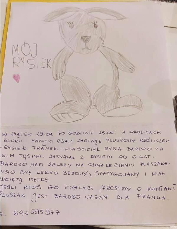 Do sieci trafił nietypowy apel o pomoc w odnalezieniu króliczka, ale nie takiego żywego, tylko pluszowego. Jak się okazało, zabawka została zgubiona w piątkowe popołudnie na os. Staszica. Pluszowy króliczek o imieniu Rysiek należał do małego Franka, który teraz tęskni za swoim kompanem. Do apelu został dołączony również rysopis Ryśka.