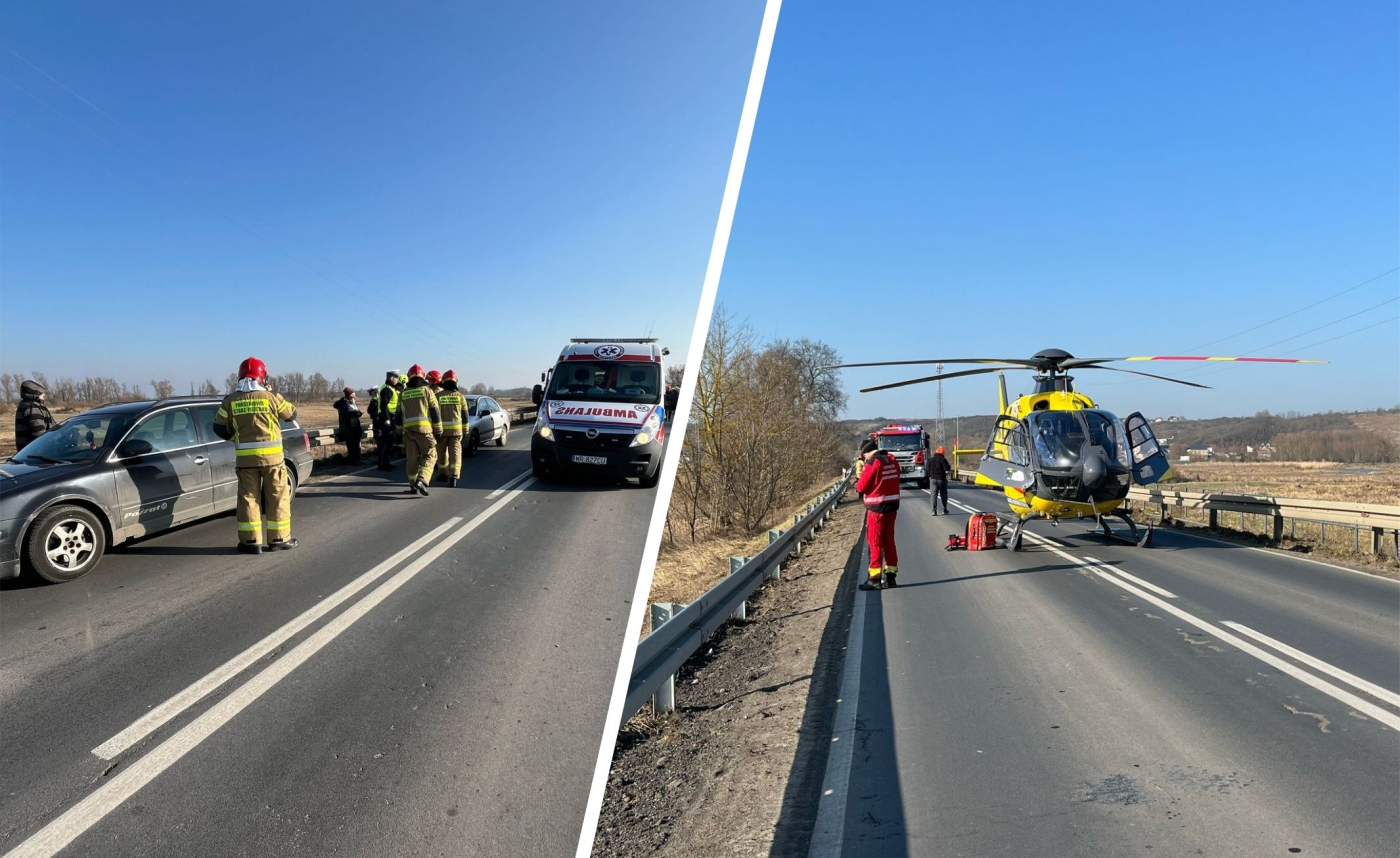 Doszło tam do zderzenia dwóch samochodów osobowych jadących w tym samym kierunku – volkswagena i mitsubishi. Do szpitala został zabrany kierujący volkswagenem. Według nieoficjalnych informacji doszło do nieudanego manewru wyprzedzania przez kierowcę volkswagena. Ten miał wyprzedzać na łuku drogi i podwójnej linii ciągłej. Niestety zahaczył o jadące mitsubishi.