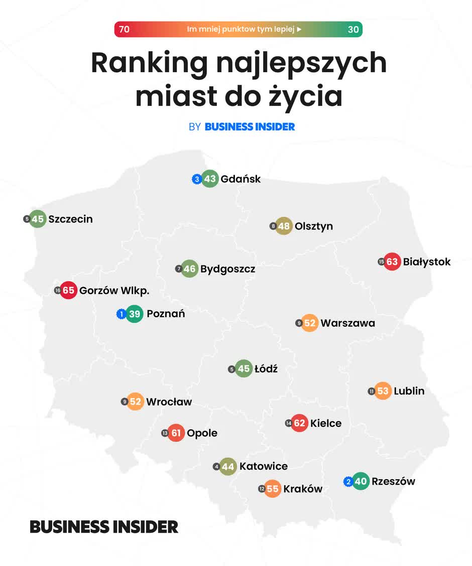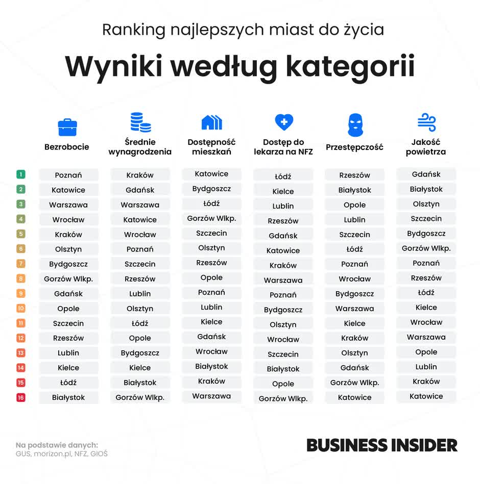Autorzy zestawienia podkreślają, że ich analiza opiera się wyłącznie na obiektywnych danych. – Wszystkie statystyki pochodzą z oficjalnych źródeł i są regularnie publikowane przez zaufane instytucje. Dane pochodzą m.in. z Głównego Urzędu Statystycznego (bezrobocie, przeciętne wynagrodzenie, przestępczość, liczba mieszkańców), Narodowego Funduszu Zdrowia (dostępność lekarzy), Głównego Inspektoratu Ochrony Środowiska (jakość powietrza) oraz portalu Morizon (ceny mieszkań) – czytamy na stronach Business Insider.