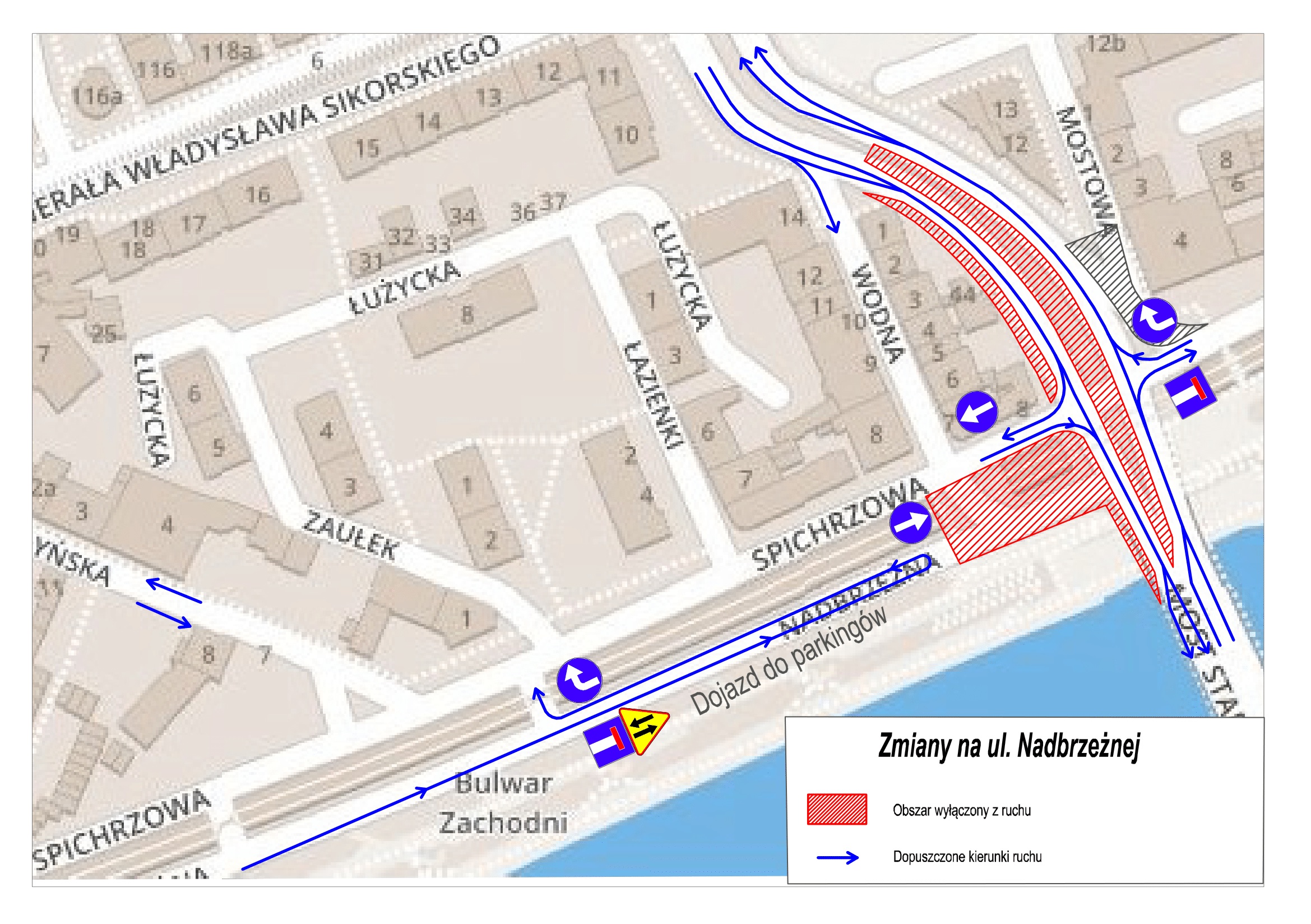 Od poniedziałku 7 kwietnia wykonawca wprowadza kolejne zmiany w organizacji ruchu. Zostanie całkowicie zamknięty przejazd pod niszą estakady kolejowej na wysokości skrzyżowania ul. Spichrzowej i Wodnej. W celu zapewnienia dojazdu mieszkańcom do miejsc parkingowych oraz dostawcom do lokali gastronomicznych, ul. Nadbrzeżna - na odcinku między przedostatnią a ostatnią niszą - będzie drogą dwukierunkową bez przejazdu. Kierowcy będą mieli możliwość zawrócenia i wyjazdu z ul. Nadbrzeżnej w ul. Spichrzową przedostatnią niszą estakady w rejonie ul. Zaułek.