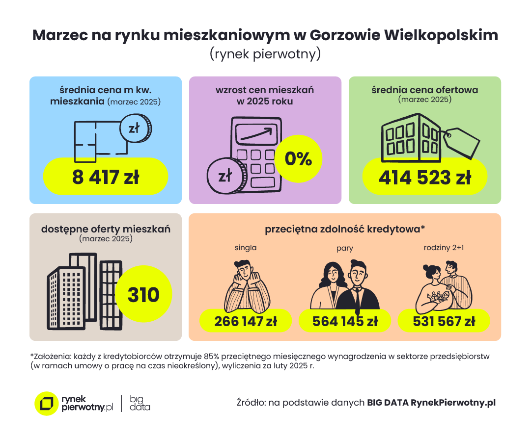 Z danych BIG DATA RynekPierwotny.pl wynika, że w marcu 2025 roku w Gorzowie Wielkopolskim dostępnych było 310 ofert mieszkań z rynku pierwotnego. Średnia cena ofertowa mieszkania wynosiła 415 tys. zł, a metr kwadratowy kosztował przeciętnie 8 417 zł. Najwięcej w ofercie stanowiły lokale dwu- i trzypokojowe – łącznie aż 87% całej puli mieszkań. Średni metraż nowego mieszkania oferowanego przez gorzowskich deweloperów to 49,5 m kw.