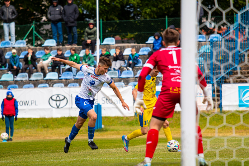 Z czasem inicjatywę zaczęli przejmować goście. Po strzale z rzutu wolnego i dwóch groźnych główkach byli bardzo blisko wyrównania, jednak na posterunku stał Szymon Czajor, który kilkoma interwencjami uratował Stilon przed stratą bramki.