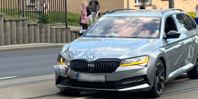 W wyniku zderzenia rozbita skoda stoi na torowisku tramwajowym. Ruch tramwajów został wstrzymany. Kierujący BMW został poszkodowany i przetransportowany do szpitala.