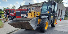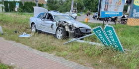 Okazało się, że doszło do zderzenia samochodu osobowego marki volkswagen i ładowarki teleskopowej. Osobówka w wyniku zderzenia z ciężkim sprzętem zatrzymała się w rowie, gdzie ścięła znak drogowy.