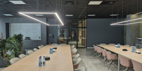 W aranżacji zastosowano beton architektoniczny 3D, jasne płytki podłogowe oraz czarne sufity podwieszane, które równoważą surowość z elegancją. Wielopoziomowe oświetlenie – od lamp panelowych po designerskie oprawy dekoracyjne – nadaje wnętrzu dynamiki i nowoczesnego wyrazu. Dodatkowym akcentem jest podświetlana mapa świata, symbolizująca globalny charakter firmy.