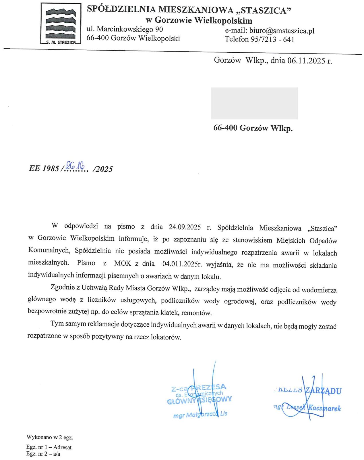 Do listu dołączono odpowiedź spółdzielni.