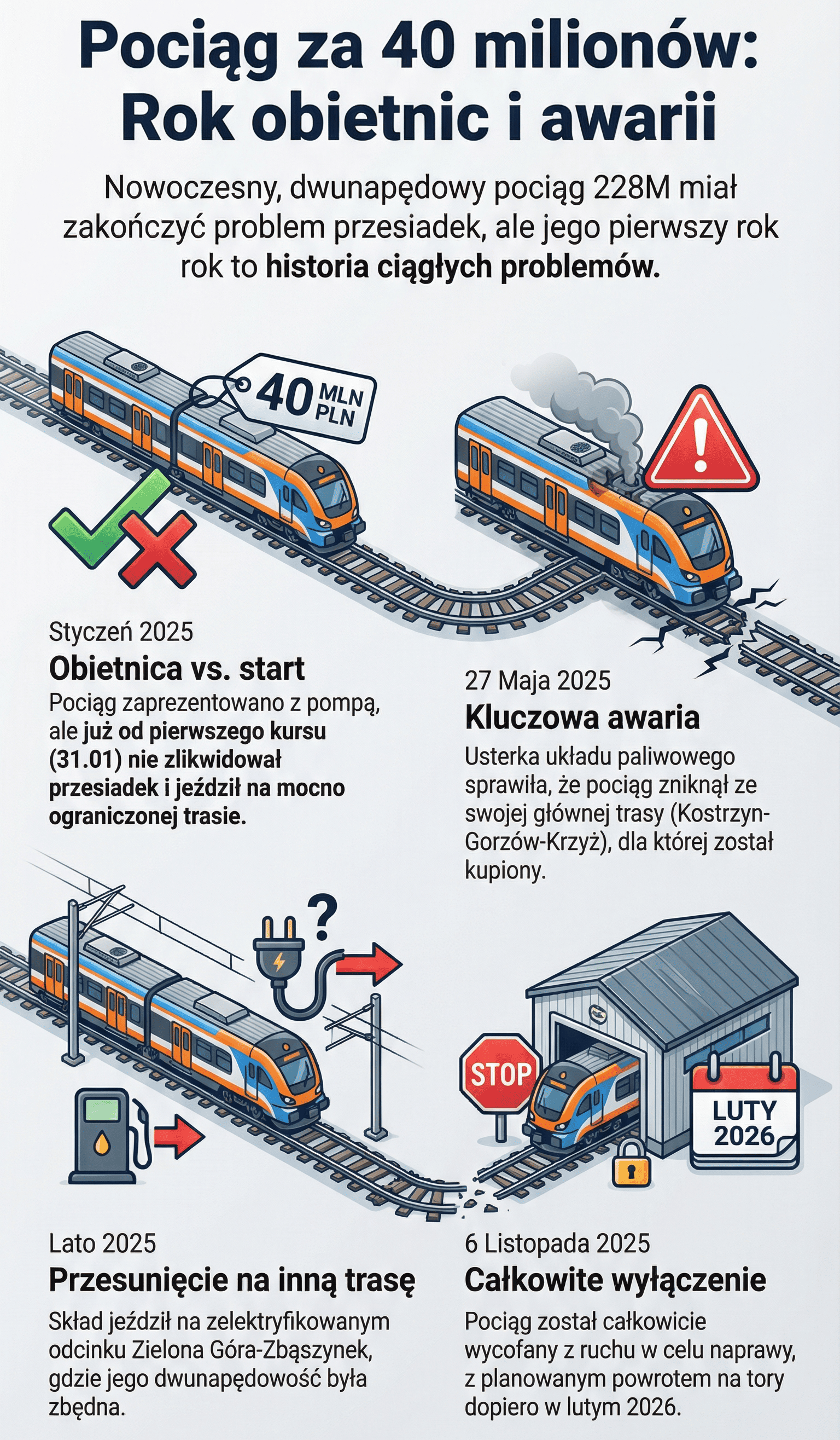 Jeżeli termin naprawy zostanie dotrzymany, pociąg wróci na tory w lutym. Tylko że po pierwszym roku historii 228M najbardziej naturalne pytanie brzmi nie czy wróci, ale na jak długo. Bo jeśli pociąg za takie pieniądze przez większą część roku jest wyłączony z ruchu, a po kluczowej awarii znika z trasy, dla której był kupiony, to nawet najlepsza data w piśmie nie zamyka sprawy. Ona dopiero otwiera kolejny rozdział: sprawdzian, czy 228M będzie wreszcie normalnie woził pasażerów na północy, czy znów szybko zniknie z torów.