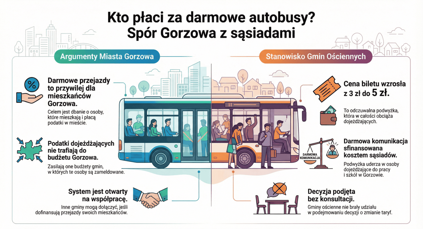 W jego ocenie problemem jest nie tylko sama cena, ale też sposób podjęcia decyzji. Wójt podkreślał, że gminy ościenne nie były konsultowane, a podwyżka uderza w osoby dojeżdżające codziennie do pracy, szkół i instytucji w Gorzowie. Wprost padła teza, że darmowa komunikacja w mieście została sfinansowana kosztem mieszkańców okolicznych gmin.