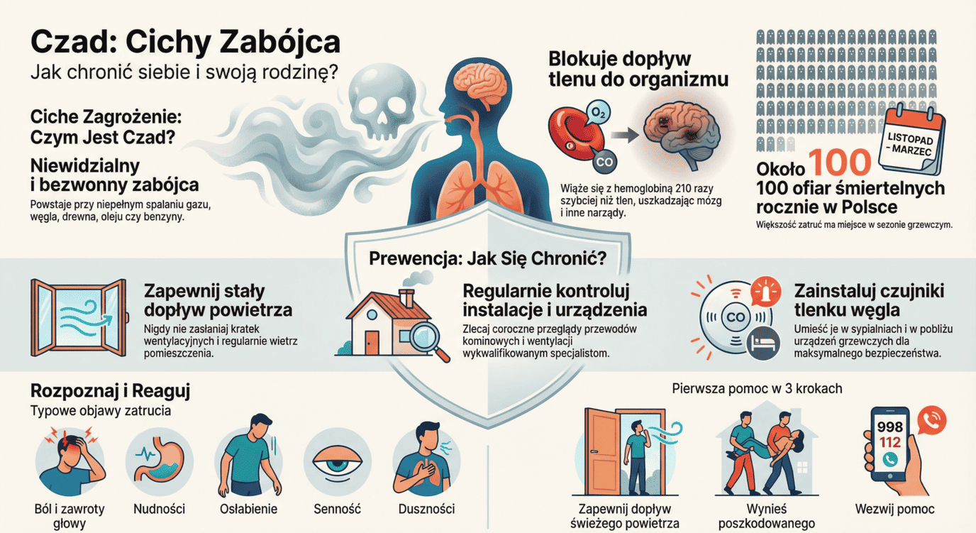 Ten przypadek ma jeden kluczowy wniosek. Przed takimi sytuacjami może uratować sprawna czujka tlenku węgla. To niewielkie urządzenie, które alarmuje wtedy, gdy stężenie czadu zaczyna być niebezpieczne – zanim człowiek straci świadomość. Czad zabija po cichu. Czujka daje sygnał, którego nie da się zignorować.