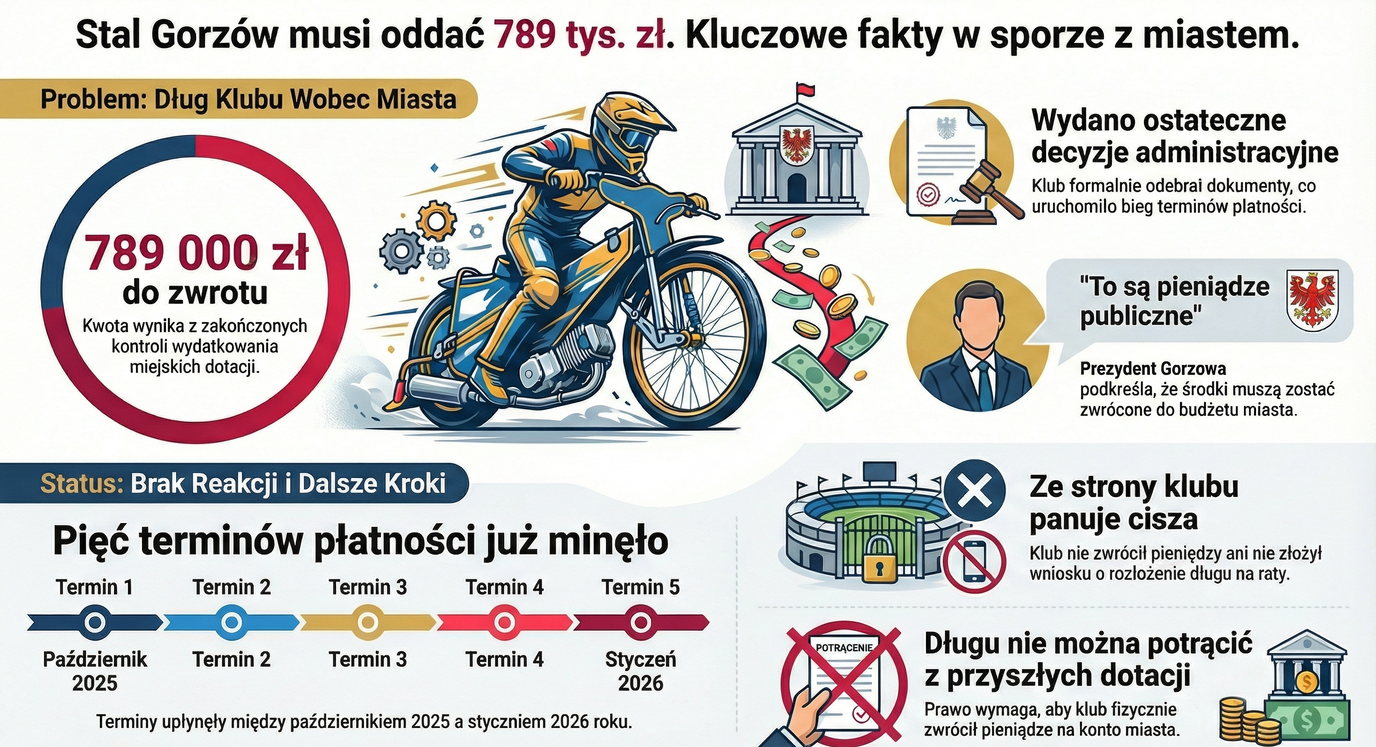 W poniedziałek 26 stycznia podczas konferencji prasowej prezydent Gorzowa potwierdził, że wobec żużlowej Stali Gorzów wydano decyzje administracyjne o zwrocie miejskich dotacji, a pięć z nich ma już przekroczony termin płatności. To oznacza, że miasto formalnie czeka na pieniądze, a klub do tej pory ich nie oddał.