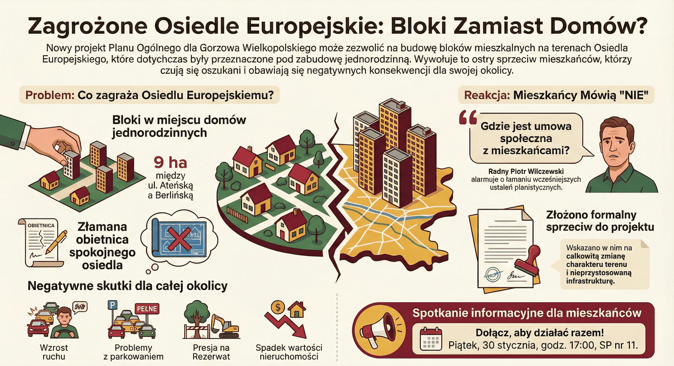Mieszkańcy mówią wprost: boimy się bloków kilka metrów od naszych domów. Natomiast Radny Piotr Wilczewski podczas Sesji Rady Miasta Gorzowa mówił wprost o łamaniu wcześniejszych ustaleń planistycznych i zagrożeniu dla mieszkańców osiedla Europejskiego.