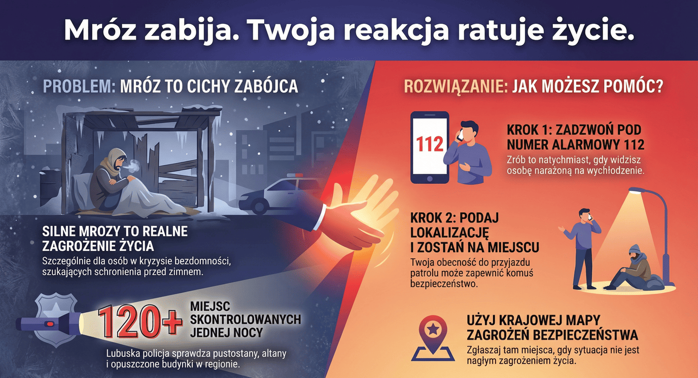 W związku z bardzo niskimi temperaturami lubuscy policjanci zintensyfikowali działania prewencyjne, koncentrując się na miejscach, w których mogą przebywać osoby bezdomne. Funkcjonariusze regularnie sprawdzają pustostany, opuszczone budynki, altany na ogródkach działkowych, klatki schodowe, wiaty oraz inne przestrzenie, w których ludzie próbują schronić się przed mrozem.