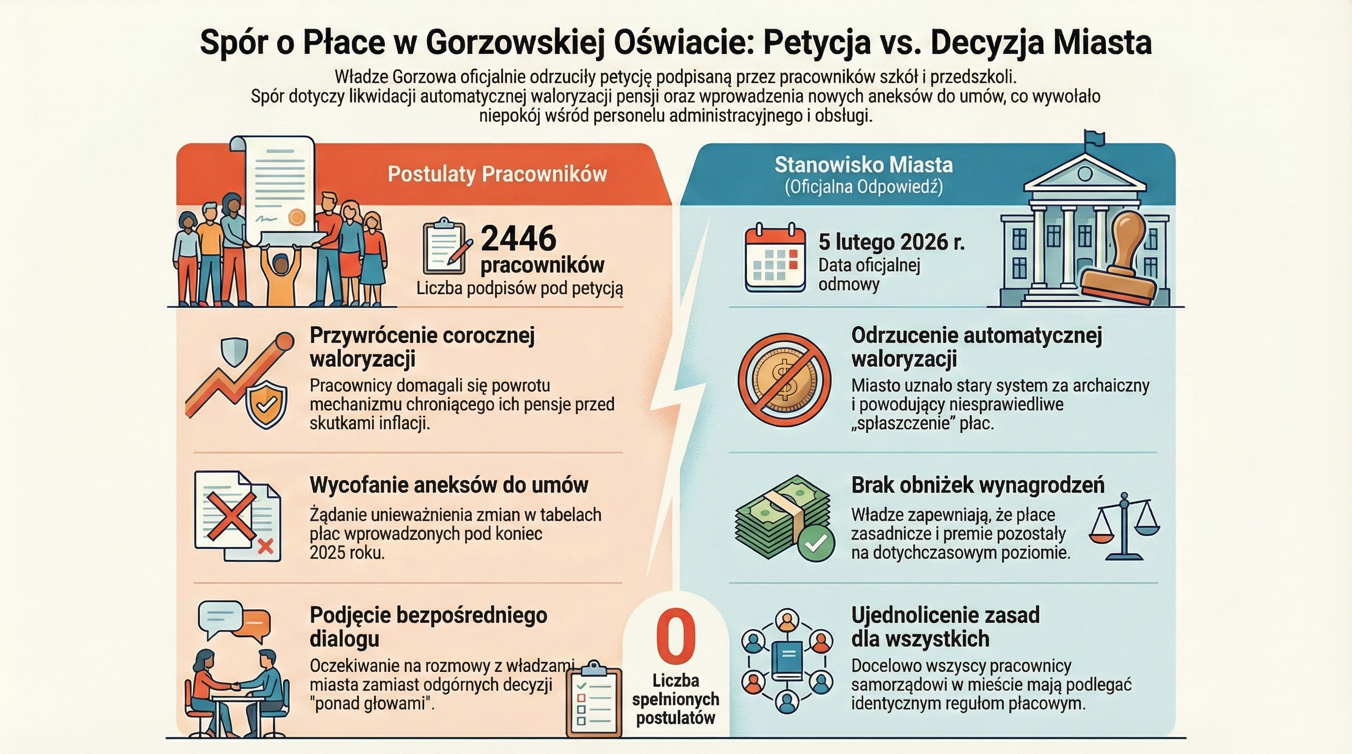 W czwartek 5 lutego 2026 roku miasto opublikowało oficjalną odpowiedź na petycję. I sprawa jest jasna: miasto nie spełnia żadnego z głównych postulatów pracowników.