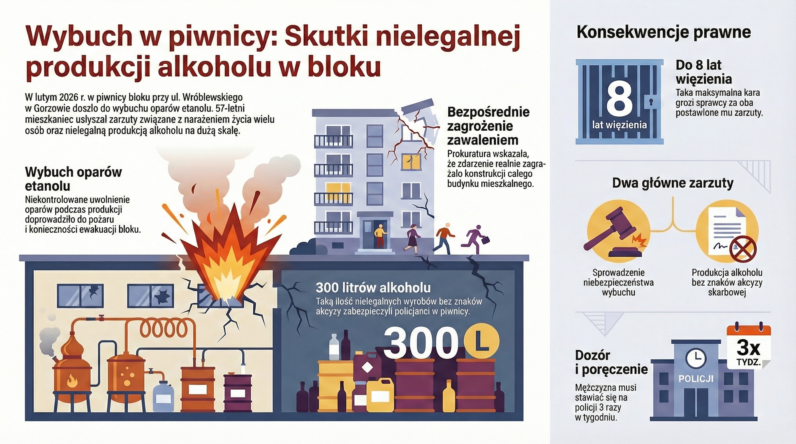 57-letniemu mężczyźnie przedstawiono dwa karne. - Jeden zarzut z kodeksu karnego dotyczy sprowadzenia bezpośredniego niebezpieczeństwa zdarzenia, to znaczy pożaru i zawalenia się budynku, poprzez doprowadzenie do niekontrolowanego uwolnienia się oparów etanolu, a w konsekwencji wybuchu - mówi w rozmowie z portalem gorzowianin.com prokurator Roman Witkowski z Prokuratury Rejonowej w Gorzowie.