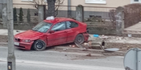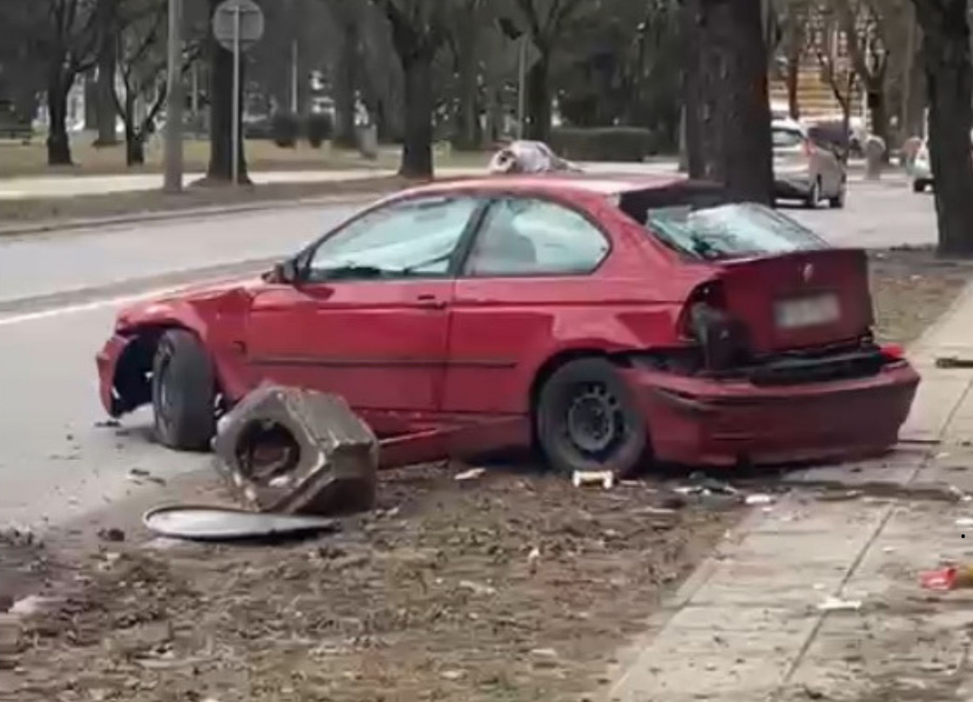 Kierujący BMW dosłownie ściął znak i betonowy śmietnik. Osoby, które podróżowały samochodem porzuciły rozbite BMW i uciekły pieszo z miejsca zdarzenia.