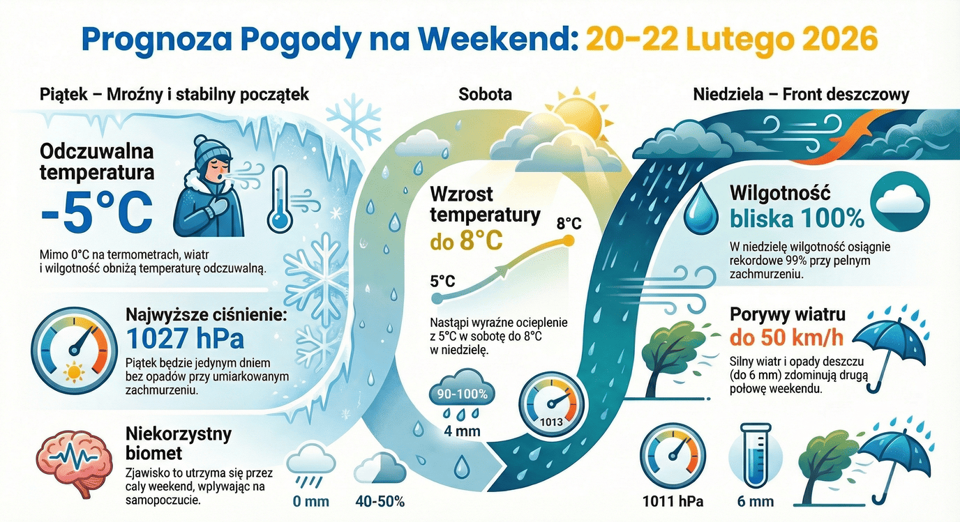 Piątek przywita nas słońcem przebijającym się przez chmury, ale nie dajcie się zwieść tym promieniom. Choć termometry pokażą zero stopni, to przez przeszywający wiatr odczujemy co najmniej -5°C. Jeśli planujecie wieczorne wyjście na miasto, ubierzcie się bardzo ciepło – w nocy temperatura spadnie do -7°C. To będzie najzimniejszy moment tego weekendu, więc warto sprawdzić akumulatory w samochodach.