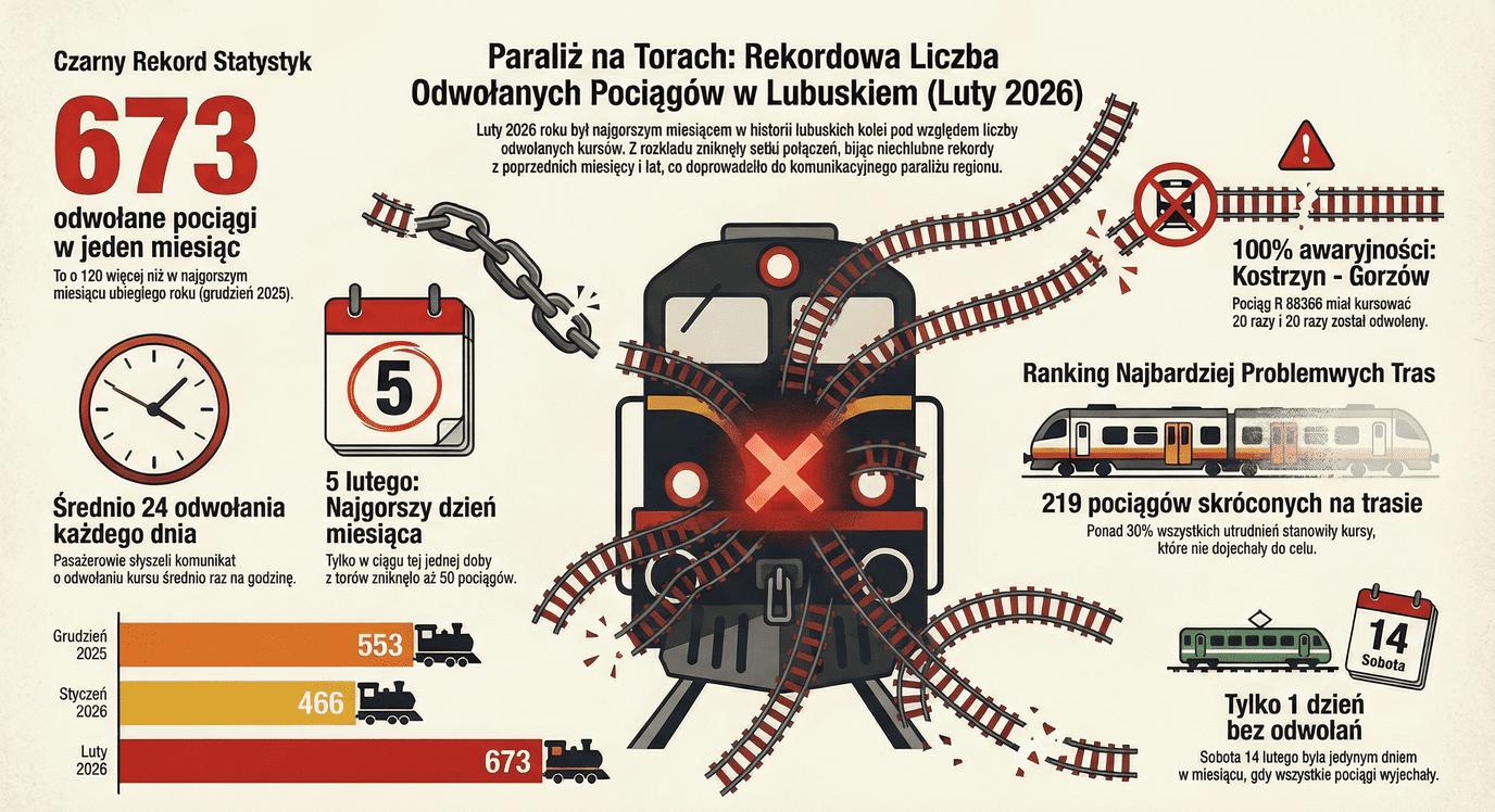 Mało tego, luty przebił również każdy miesiąc 2025 roku. Dla porównania - najgorszy miesiąc ubiegłego roku - grudzień zakończył się wynikiem 553 odwołań. Luty przebił go o 120. Podsumowanie przygotowało stowarzyszenie komunikacja.org wspólnie z profilem „Czy ZKA w Lubuskim dziś wyjechało?”.