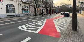Obecnie dwa pasy dla samochodów przechodzą w jeden, aby tuż przed sygnalizacją świetlną ponownie rozdzielić się na dwa. Taka konfiguracja wymusza na kierowcach skręcających w prawo ustąpienie pierwszeństwa rowerzystom poruszającym się śluzą.