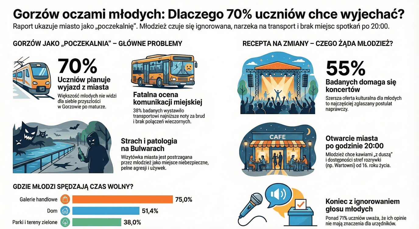 Młodzi ludzie nie zostawiają na Gorzowie suchej nitki. Z najnowszego raportu "Co jest nie tak z tym miastem?" wyłania się obraz miasta, z którego chce się uciekać. Aż 70 procent uczniów gorzowskich szkół deklaruje, że po odebraniu świadectwa maturalnego nie zamierza tutaj zostać. Gorzów dla młodych to nie dom, to poczekalnia, w której jedynym oknem na świat są galerie handlowe. To potężny cios dla Urzędu Miasta Gorzowa który od lat promuje miasto jako idealne miejsce do życia.