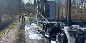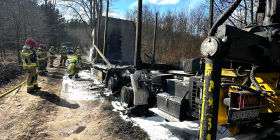 W czwartek 2 kwietnia o godz. 14.28 służby otrzymały zgłoszenie o pożarze samochodu ciężarowego na drodze leśnej nr 1 za Ściechowem w kierunku jeziora Marwicko. Na miejsce zostało wysłanych łącznie 5 zastępów straży pożarnej i straż leśną.