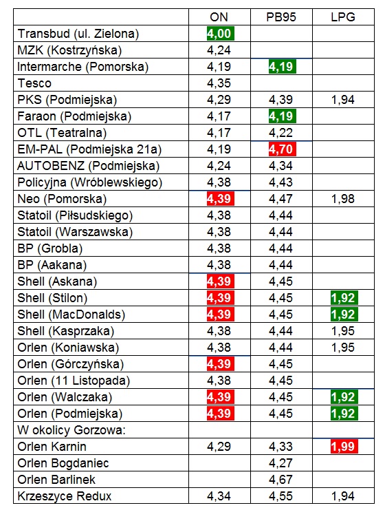 Poniższe zestawienie zostało przygotowane na podstawie informacji od użytkowników strony „Tańsze paliwo w Gorzowie” zebranych w dniach 20-22.10.2015. Dane prezentowane są w taki sposób jak podali użytkownicy. Niektóre stacje nie prowadzą dane rodzaju paliwa (np. na MZK można kupić tylko ON), a niektórych cen użytkownicy po prostu nie podali (najczęściej LPG).