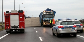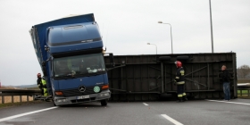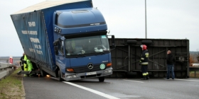 49-letni kierowca nie mógł opanować pojazdu i wpadł w poślizg. Ciężarówkę obróciło, a dodatkowo silny wiatr pomógł w przewróceniu naczepy w której był przewożony styropian.