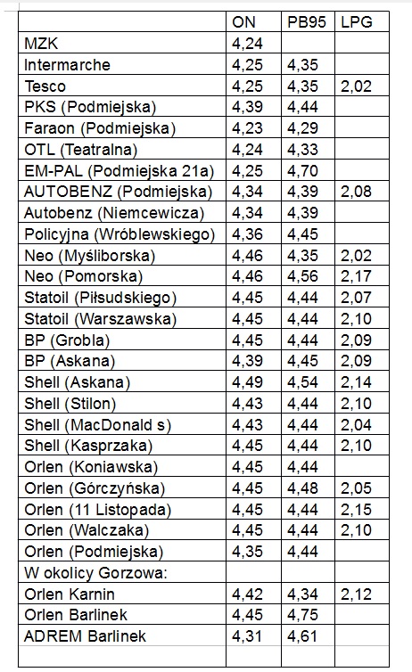 Poniższe zestawienie zostało przygotowane na podstawie informacji od użytkowników strony „Tańsze paliwo w Gorzowie” zebranych w dniach 11-13.11.2015. Dane prezentowane są w taki sposób jak podali użytkownicy. Niektóre stacje nie prowadzą danego rodzaju paliwa (np. na MZK można kupić tylko ON), a niektórych cen użytkownicy po prostu nie podali (najczęściej LPG).