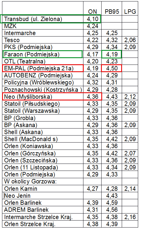 Poniższe zestawienie zostało przygotowane na podstawie informacji od użytkowników strony „Tańsze paliwo w Gorzowie” zebranych w dniach 25-27.11.2015. Dane prezentowane są w taki sposób jak podali użytkownicy. Niektóre stacje nie prowadzą danego rodzaju paliwa (np. na MZK można kupić tylko ON), a niektórych cen użytkownicy po prostu nie podali (najczęściej LPG).