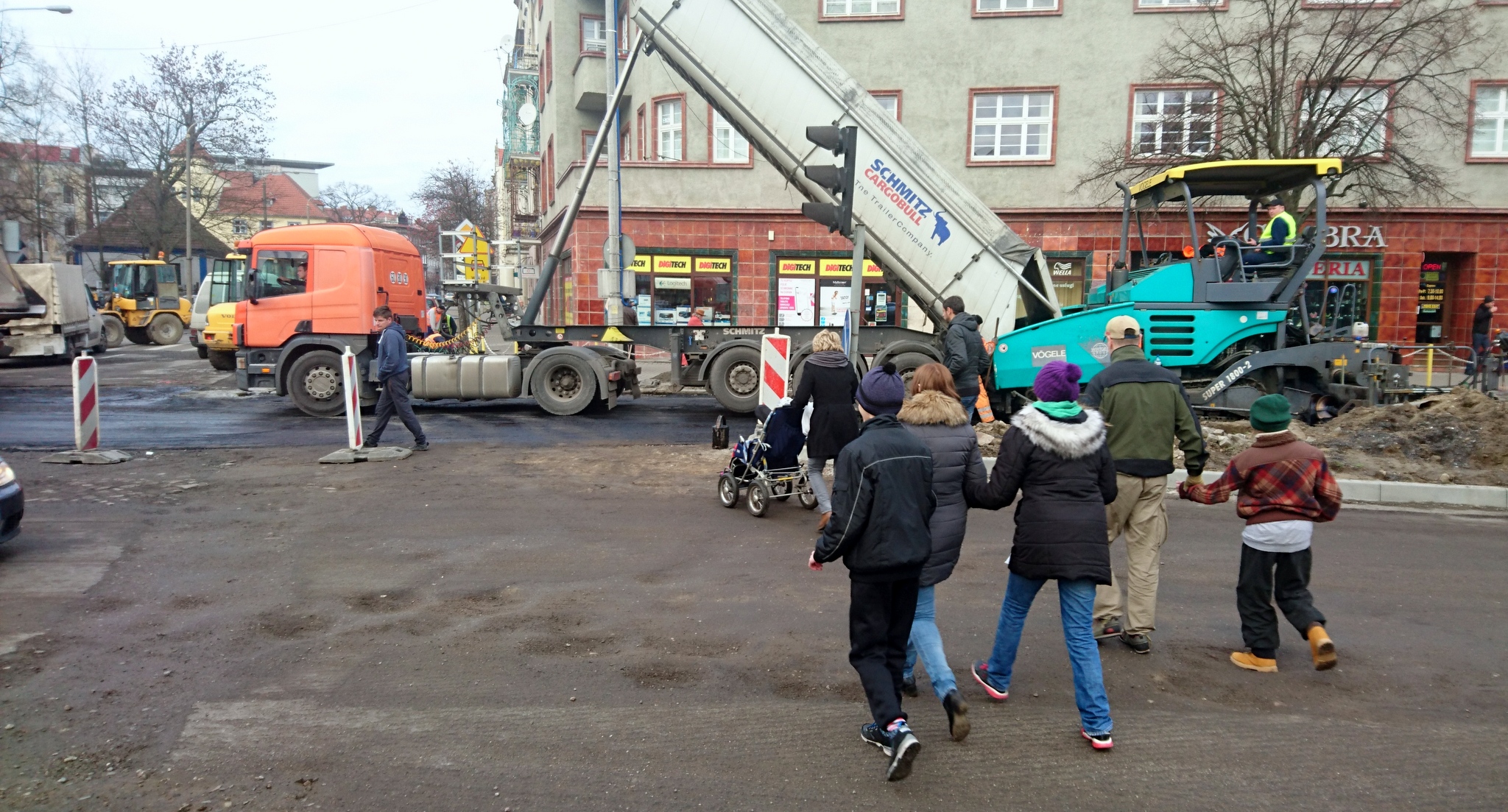 To, co dzieje się od kilku dni przy remontowanej Jagiełły jest już naprawdę karygodne. Większość pieszych jest zdezorientowana. Nie dość, że ludzie nie wiedzą gdzie jest czynny przystanek autobusowy, to na dodatek nie wiedzą jak i gdzie przejść przez jezdnię. Na efekty nie trzeba długo czekać. Jeżeli nie ma przejścia, to idziemy na przełaj. Tak jak ta matka z dzieckiem w wózku i rodzice z dziećmi. Przechodzą przez wciąż czynną jedną nitkę ulicy Jagiełły, aby za chwil kilka przemknąć niepostrzeżenie pomiędzy ogromną ciężarówką z asfaltem i walcami drogowymi.