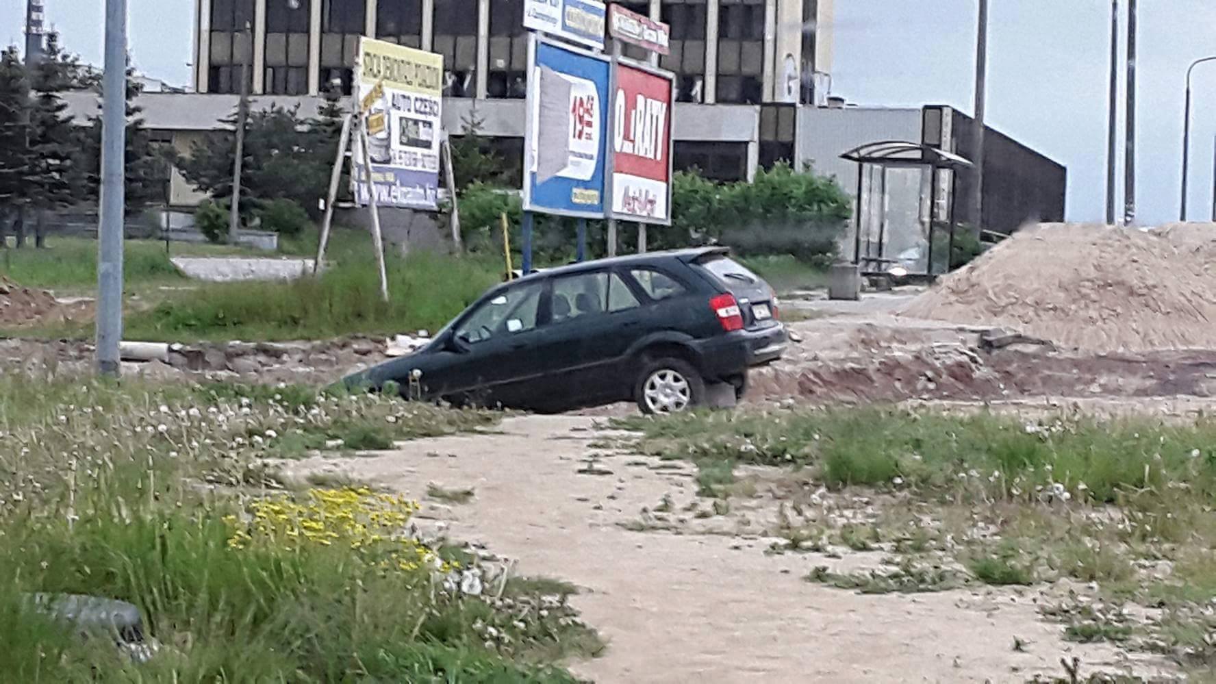 Kierowca mazdy chciał skręcić w ul. Złotego Smoka i wjechał… w rozkopaną drogę. Przód auta aż wbił się w piasek, natomiast tył zatrzymał się na studzience. Kierowcy prawdopodobnie nic się nie stało. Nie wiadomo też dlaczego zjechał na remontowaną drogę - być może pojechał na pamięć, lub po prostu zasnął za kierownicą. Policja nie miała żadnego zgłoszenia o takim zdarzeniu.