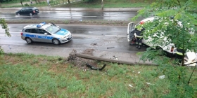 Okazało się, że doszło tam do zdarzenia, w którym ford transit jadący w kierunku ul. Myśliborskiej w pewnej chwili zjechał na chodnik i ściął słup oświetleniowy.