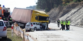 Samochód ciężarowy wyleciał z drogi na nowobudowany pas S3 i przygniótł osobową dacię. Kilkadziesiąt metrów wcześniej zmiażdżony został mercedes - jego kierowca zginął na miejscu. Z kolei ciężko ranny został kierowca dacii, który walczy w szpitalu o życie. Obrażenia ma również pasażer dacii oraz kierowca samochodu ciężarowego.